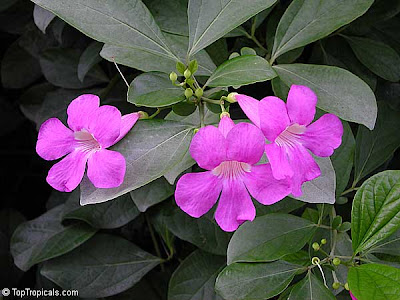 Medium-sized light purple trumpet-shaped flower with a white throat, five rounded lobes and a flattened corolla tube; the flowers are borne in dense clusters and have a distinct garlic odour. A moderately vigorous vine with attractive glossy garlic-scented leaves.