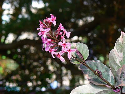 Tiny mildly fragrant rose purple flowers with five acutely recurved petals edged in white; borne in short dense axillary and terminal panicles. A small tree with edible fruit.