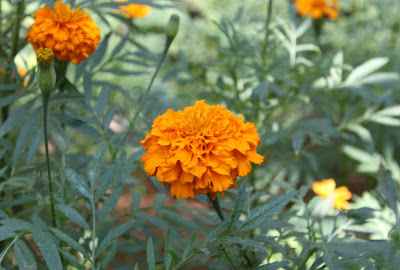 Medium to large compact double compositae orange to orange yellow flowers with convoluted petals; borne singly or in few-flowered clusters. An annual or perennial herb with strongly aromatic leaves.