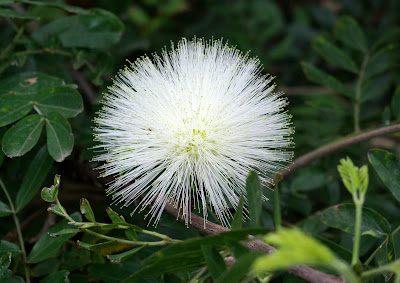 Medium-sized powderpuff head composed of white stamens; borne from the leaf axils. A tall spreading shrub.